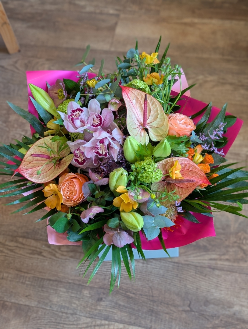 Our handtied gift bouquets are created using the freshest seasonal flowers and are packaged in water in a gift bag ready to be placed into a vase.