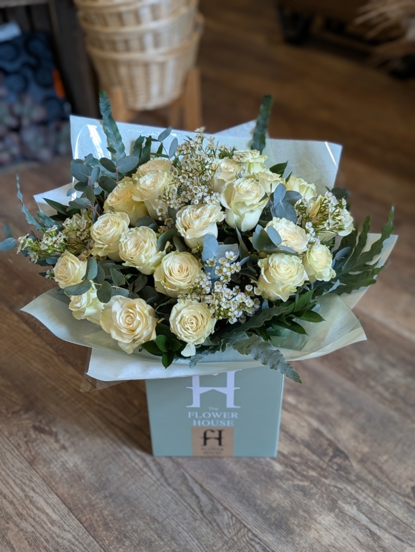Our luxury rose bouquets are made to order by one of our Flower House florists and come beautifully arranged and packaged in a gift bag or gift box ready to be placed into a vase.