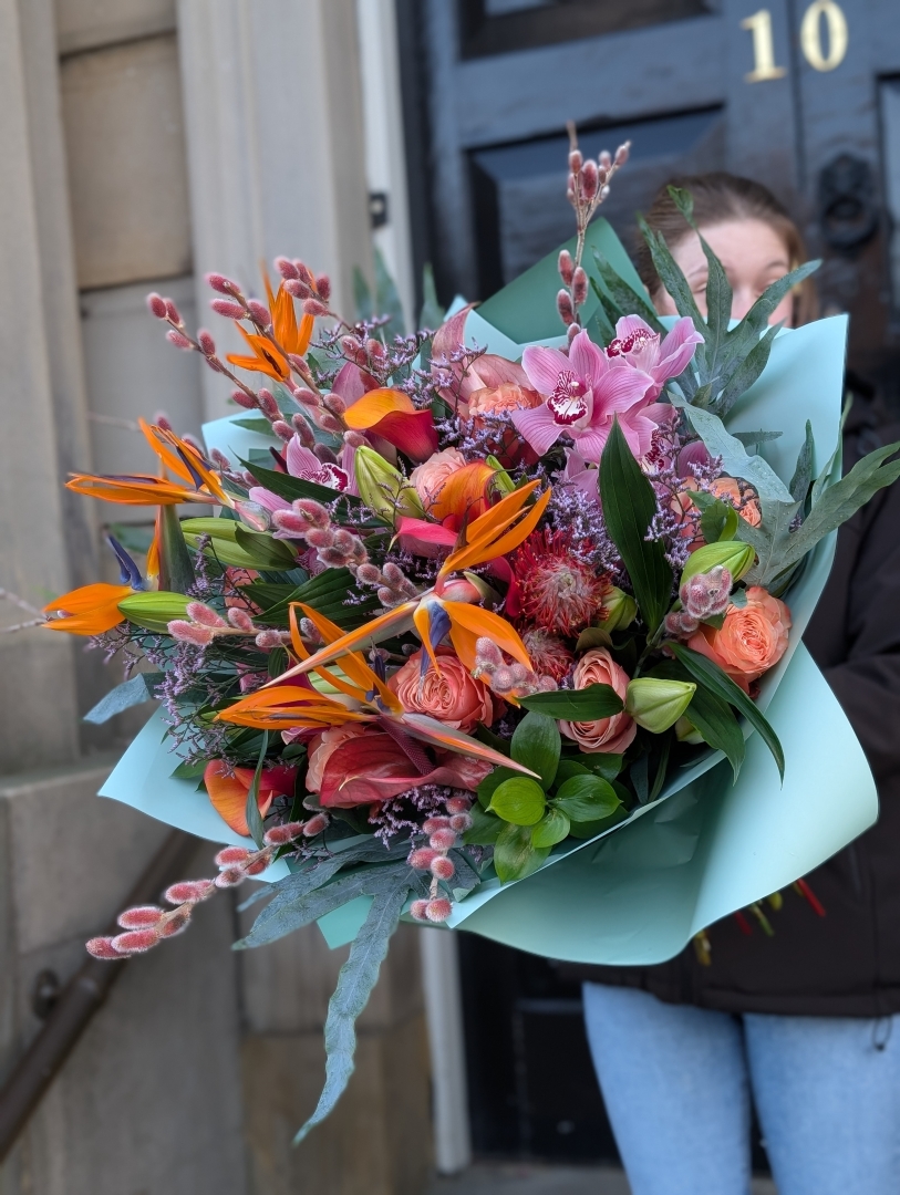 Celebrate her with a breathtaking statement of love — our Big Mamma Showstoppa Mother’s Day Bouquet, an opulent arrangement designed to honor the extraordinary woman she is. Overflowing with exotic beauty, this show-stopping bouquet features pink cymbidium orchids, sculptural glossy anthuriums, vibrant calla lilies and striking birds of paradise. Each bloom is thoughtfully selected for its vibrant colour, architectural form, and long-lasting freshness.