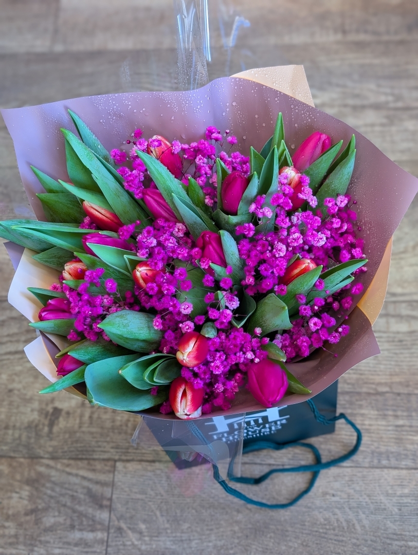 This fun, vibrant bouquet is a joyful celebration of spring. Featuring a generous gathering of elegant tulips paired with vibrant cerise gypsophila, this Mother’s Day arrangement feels light, modern, and full of personality.